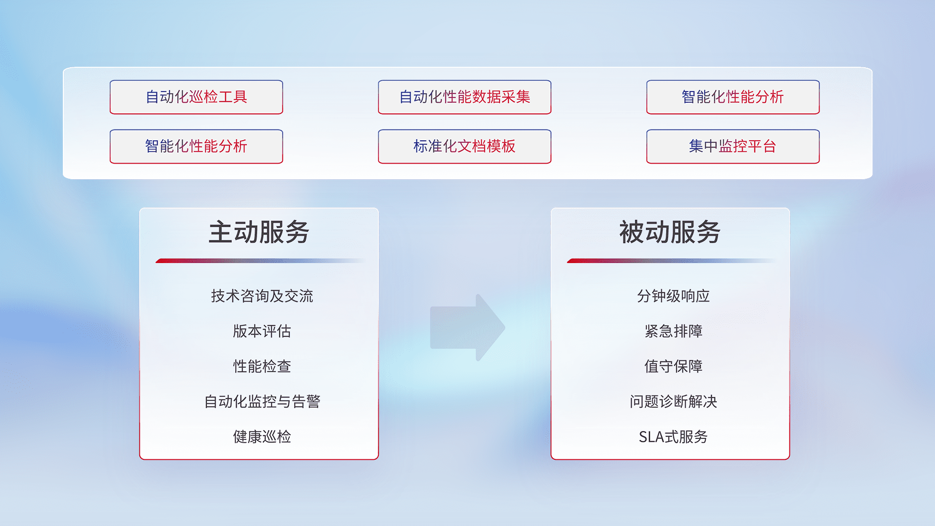 智能化工具和标准化文档,,,保障服务质量,,,,提供主动服务(包含技术咨询、、版本评估、、、、性能检查、、自动化监控与告警、、、、健康巡检)和被动服务包含(分钟级响应、、、紧急排障、、值守保障、、、、问题诊断解决、、、、SLA服务)。。。。